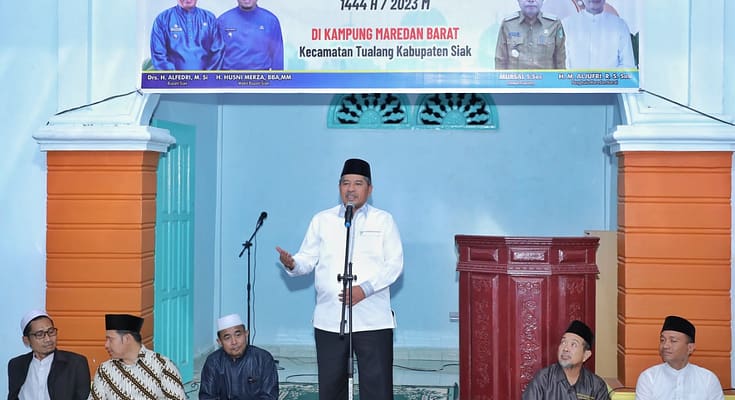 Siak | riauindependen.co.id | Bupati Siak Alfedri memimpin pelaksanaan Safari Ramadan Pemerintah Kabupaten Siak, di Masjid Irsyadul Ibad Dusun Kampung Madura Kampung Meredan Barat Kec. Tualang, Kamis (30/3/23).