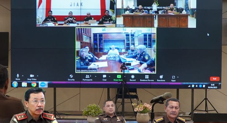 Pekanbaru | riauindependen.co.id | Kejaksaan Tinggi Riau laksanakan Video Conference Ekspose Pengajuan Penghentian Penuntutan Berdasarkan Keadilan Restoratif dengan Direktur OHARDA pada Jaksa Agung Muda Tindak Pidana Umum Kejaksaan Agung RI Agnes Triani, SH., MH, bertempat di Ruang Vicon Lt. 2 Kejaksaan Tinggi Riau, Selasa (4/4/2023).