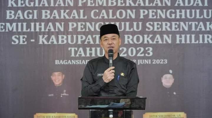 Rohil | riauindependen.co.id | Bupati Rokan Hilir (Rohil) Afrizal Sintong secara resmi membuka pembekalan adat bagi para calon Penghulu yang akan mengikuti pemilihan penghulu (Pilpeng) serentak tahap 1 tahun 2023, di kantor Lembaga Adat Melayu Riau (LAMR) Rohil, Senin (12/6/2023).
