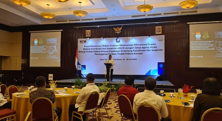 Jakarta | riauindependen.co.id | Wakil Jaksa Agung Dr. Sunarta hadir dan memberikan sambutan pada Acara Rapat Koordinasi Evaluasi Pelaksanaan Perjanjian Kerja Sama (PKS) antara Deputi Bidang Koordinasi dan Supervisi Komisi Pemberantasan Korupsi (KPK) RI dengan Jaksa Agung Muda Bidang Tindak Pidana Khusus (JAMPIDSUS) Kejaksaan RI Nomor: 56 Tahun 2023 dan Nomor: B-1/F/FJP/02/2023 tanggal 08 Februari 2023 tentang Koordinasi dan Supervisi Penanganan Perkara Tindak Pidana Korupsi, bertempat di Hotel Aston Bogor Jawa Barat, Rabu (26/7/2023).