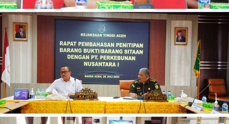 Blangpidie | riauindependen.co.id | Kejaksaan Tinggi Aceh antara pihak PT Perkebunan Nusantara I dilaksanakan pertemuan dengan agenda “Rapat Pembahasan Penitipan Barang Bukti/Barang Sitaan Kejaksaan Tinggi Aceh dengan PT Perkebunan Nusantara I” dalam perkara tindak pidana korupsi pada kegiatan usaha perkebunan kelapa sawit di atas tanah negara oleh PT Cemerlang Abadi, bertempat di Kantor Kejaksaan Tinggi Aceh, Rabu (26/7/2023).