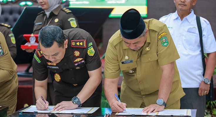 Pekanbaru | riauindependen.co.id | Bupati Siak Alfedri menandatangani perjanjian MoU (Memorandum of Understanding) Jaga Zona Pertanian, Perekonomian, dan Perindustrian (Jaga Zapin) bersama Bupati/wali kota dan Kepala Kejaksaan Negeri (Kejari) se-wilayah Riau.