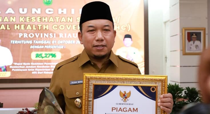 Pekanbaru | riauindependen.co.id | Bupati Siak melalui wakil bupati Siak Husni Merza menerima piagam  penghargaan Universal Health Coverage (UHC) dari BPJS Kesehatan, yang di serahkan secara langsung Gubernur Riau Syamsuar, bertempat di Gedung Daerah Pauh Janggi Pekanbaru Provinsi Riau, Senin (16/10/2023).