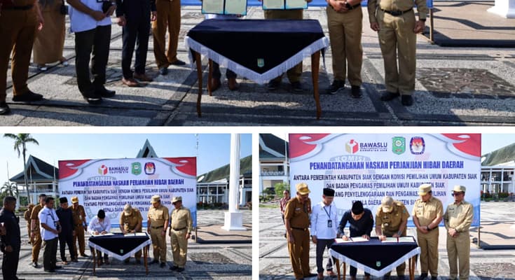 Penandatanganan perjanjian hibah daerah untuk Pemilu Pilkada 2024 dilakukan oleh Bupati Siak Alfedri, Ketua KPU dan Ketua Bawaslu Siak, usai apel rutin Senin pagi di Halaman Kantor Bupati Siak.