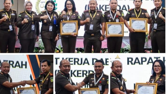 Pekanbaru | Riauindependen.co.id | Kepala Kejaksaan Tinggi Riau Akmal Abbas, S.H., M.H., diwakili oleh Wakil Kepala Kejaksaan Tinggi Riau Hendrizal Husin, SH., MH memberikan Piagam Penghargaan kepada Kejaksaan Negeri Terbaik pada Rapat Kerja Daerah (Rakerda) Kejaksaan Tinggi Riau Tahun 2023.