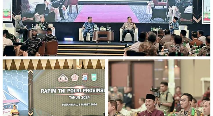 Penjabat (Pj) Gubernur Riau, SF Hariyanto pada sambutannya sekaligus menjadi keynite speaker menyampaikan bahwa Rapat Pimpinan (Rapim) TNI – Polri Provinsi Riau tahun 2024 ini mengangkat tema “Sinergitas TNI-POLRI dalam menjaga stabilitas keamanan guna mendukung percepatan transformasi ekonomi yang inklusif dan berkelanjutan di Provinsi Riau”.