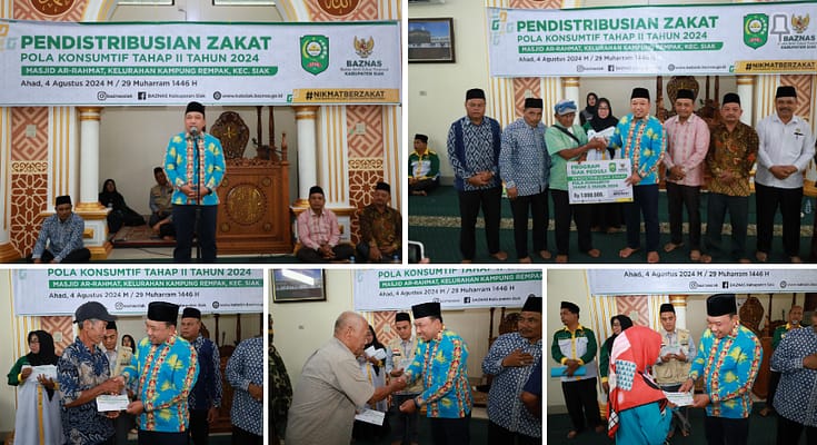 Siak | Riauindependen.co.id | Badan Amil Zakat Nasional (BAZNAS) Kabupaten Siak, mendistribusikan zakat pola konsumtif tahap II tahun 2024 kepada 197 mustahik di lima kampung di Kecamatan Siak, Acara ini berlangsung di Masjid Ar Rahmat, Kampung Rempak, Kecamatan Siak, Kamis (1/8/2024).