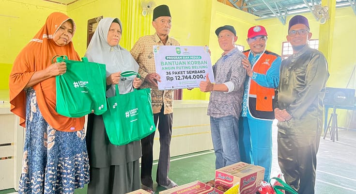 Dayun, Siak | Riauindependen.co.id | Pemerintah Kabupaten (Pemkab) Siak melalui Dinas Sosial bekerja sama dengan Badan Amil Zakat Nasional (Baznas) Kabupaten Siak menyalurkan bantuan kepada warga terdampak bencana angin puting beliung di Kampung Sialang Sakti, Kecamatan Dayun, Selasa siang (7/10/2025).