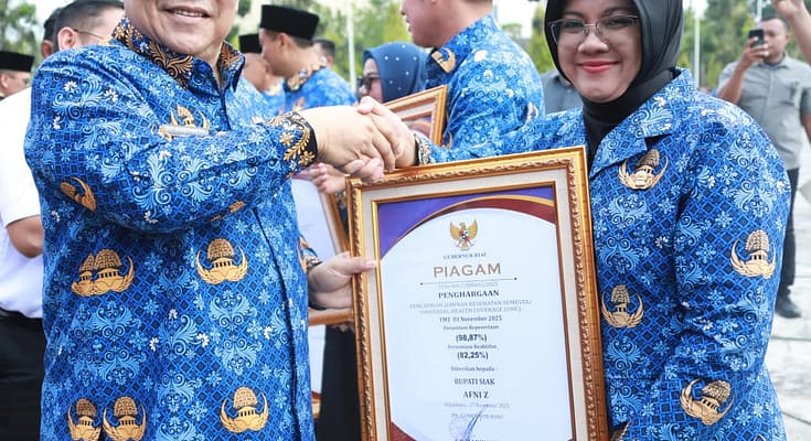Pekanbaru | Riauindependen.co.id | Pemerintah Kabupaten Siak kembali menorehkan prestasi dengan meraih Piagam Penghargaan Universal Health Coverage (UHC) pada Peringatan Hari Kesehatan Nasional (HKN) 2025.