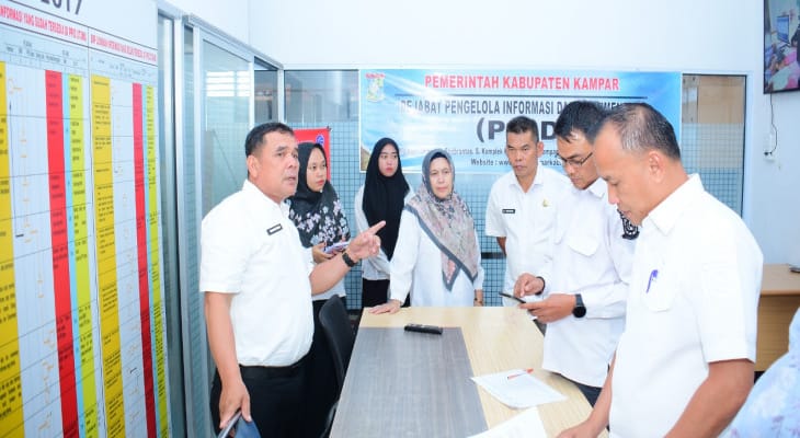 Tim asesor dari Bagian Organisasi (Ortal) Setda Kampar hadir untuk melakukan pemeriksaan langsung, termasuk verifikasi data, mekanisme layanan, dan fasilitas yang tersedia di Diskominfo.