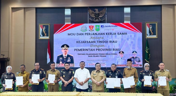 Pekanbaru | Riauindependen.co.id | Pemerintah Provinsi Riau bersama Kejaksaan Tinggi Riau resmi menandatangani Memorandum of Understanding (MoU) dan Perjanjian Kerja Sama tentang Pelaksanaan Pidana Kerja Sosial bagi Pelaku Tindak Pidana di wilayah Riau, Selasa (02/12/2025). Langkah ini menjadi upaya memperkuat sistem pemidanaan yang lebih humanis dan berorientasi pada pemulihan sosial.
